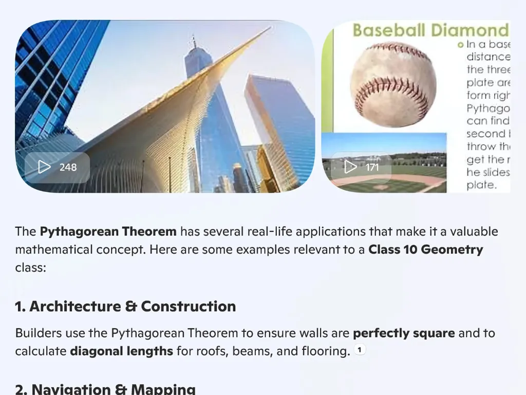 Prompt: Provide examples of real-life applications of the Pythagorean theorem for class 10 geometry class.